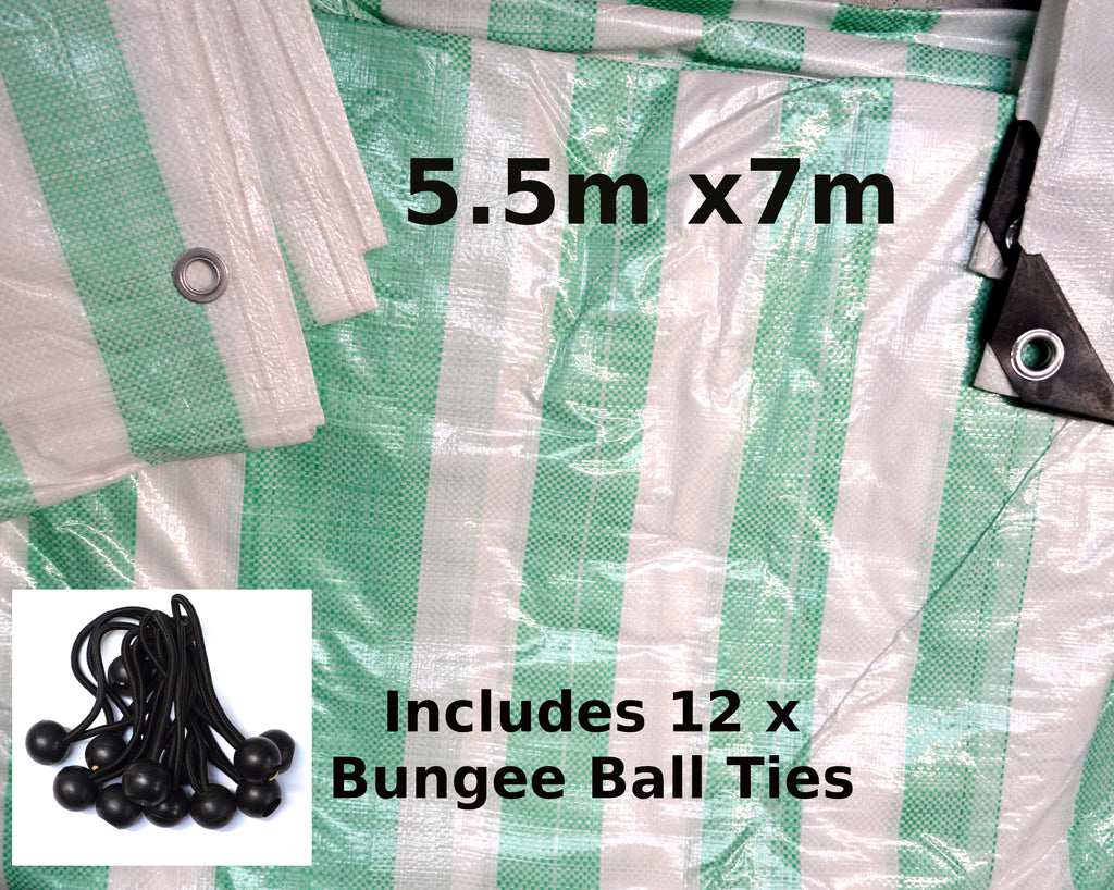 5.5 x 7.0 metre Green and White Striped Waterproof Tarpaulin Covers with eyelets